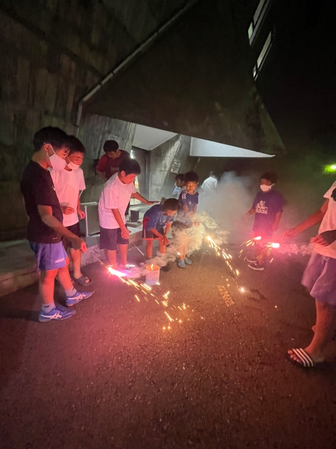 1日目はホームグラウンド(雨間グランド)で近隣の2チームを招待して交流戦を行い、昼食をはさんで一日朝を流しました。お昼は牛丼弁当。交流戦終了後は、大学セミナーハウスへ移動。受付終了後は、各部屋に入って荷物を置いた後、施設内のバーベキュー場でバーベキューを楽しみました。そのあと、雨の中で花火大会を慣行。施設の建物のひさし部分をお借りして、なんとかぬれずに実施できました。